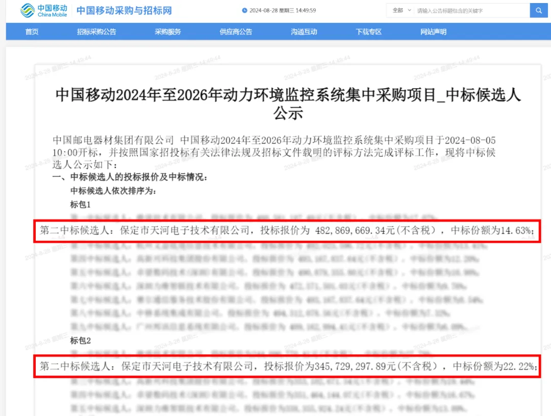近日,保定市天河電子技術(shù)有限公司以兩個(gè)第二名的優(yōu)異成績(jī),成功中標(biāo)中國(guó)移動(dòng)2024-2026年動(dòng)力環(huán)境監(jiān)控系統(tǒng)集采項(xiàng)目的匯聚機(jī)房與核心機(jī)樓雙標(biāo)段。