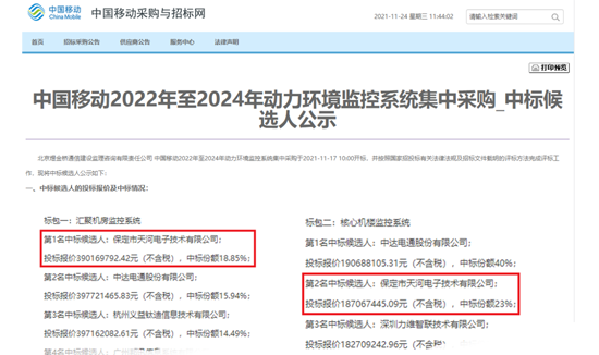 天河電子中標(biāo)中國移動2024-2026動環(huán)監(jiān)控集采項目